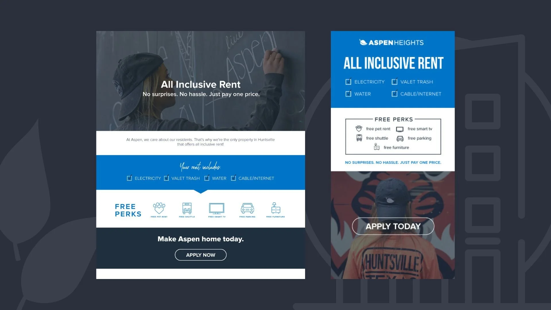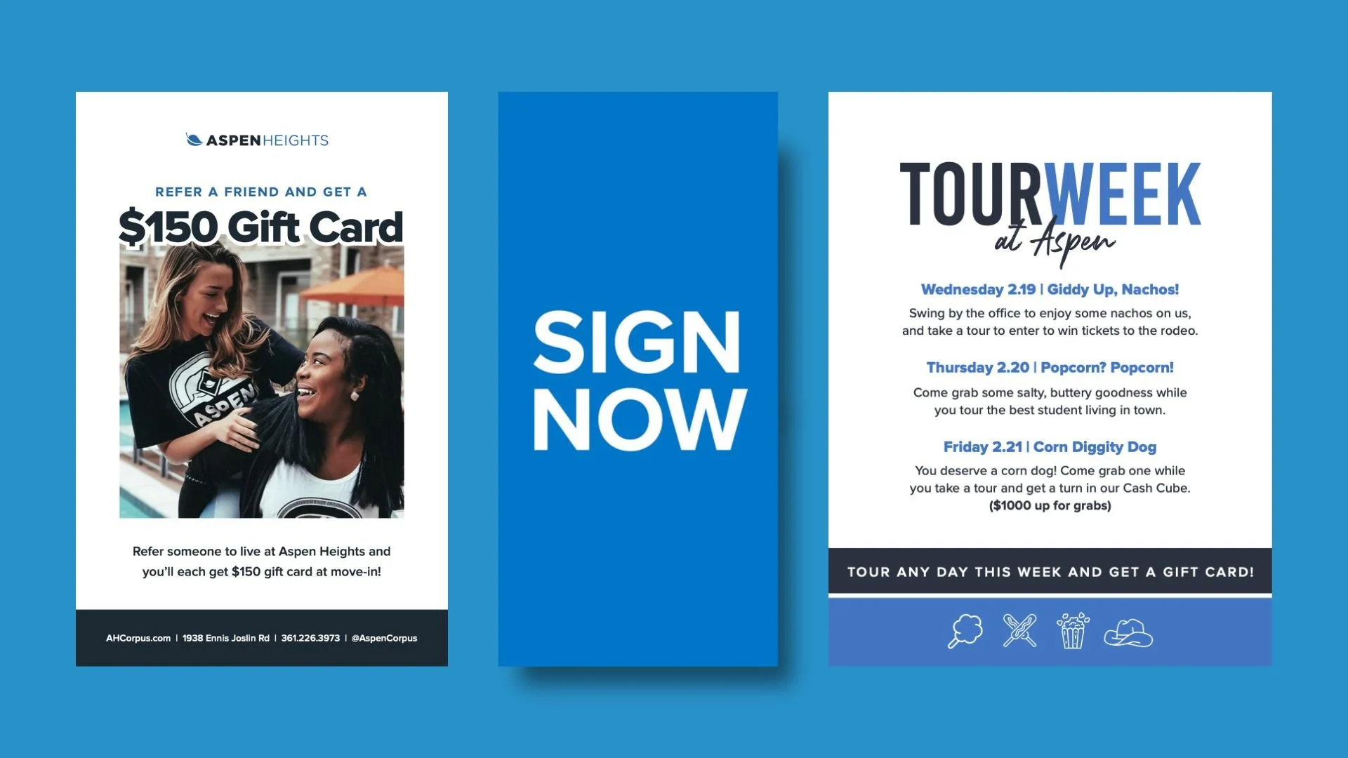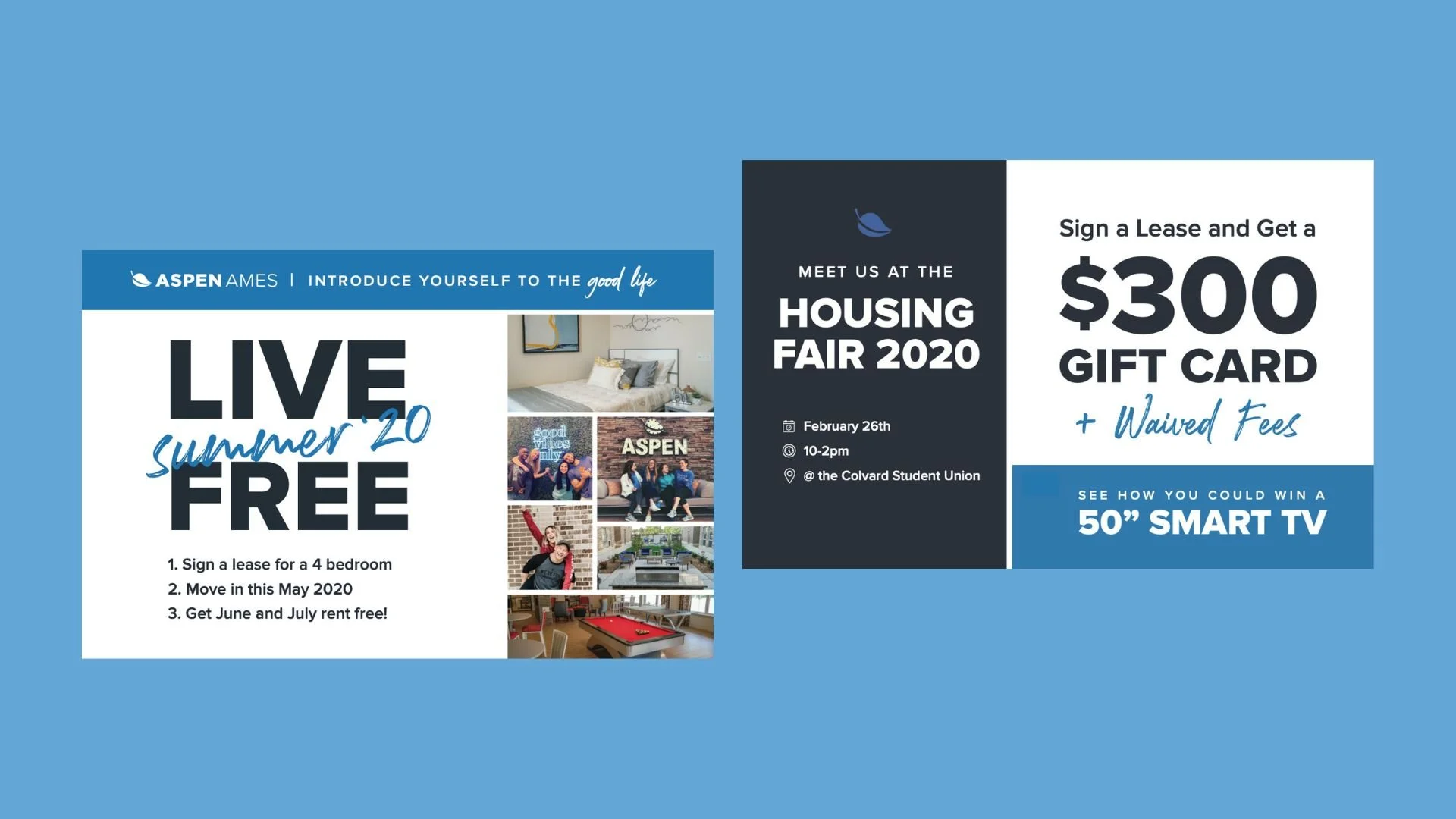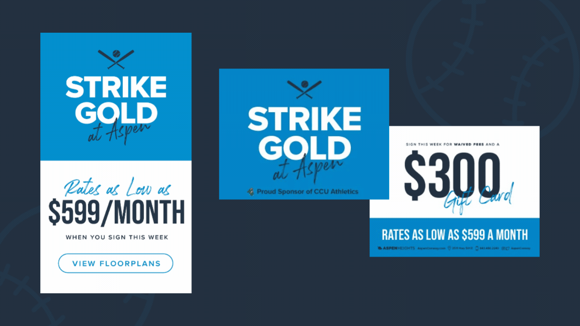 Aspen Heights Partners is a student housing company with properties across America. While at Aspen, I contributed to campaign conceptualization and created digital and printed materials for event and sales promotions; such as flyers, a-frame signs, billboards, emails, direct mailers, apparel designs, website banners, digital ads, and more.